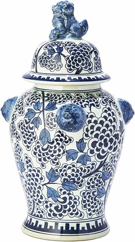 Two's Company Blue/White Peony Flower Covered Temple Jar With Lion Accents